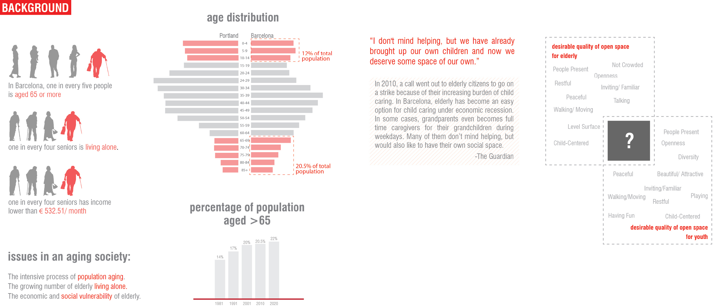 In Barcelona, increasing economic pressure, solitude, and childcare responsibility have left the elderly and youth in a socially vulnerable position. Public spaces facilitating intergenerational interactions can empower both groups by strengthening their social reciprocity.